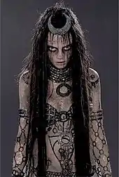 The Enchantress then helps the Ragman defeat an assassin sent to kill him, in the course of which they are attacked by the Wild Hunt of legend and temporarily transformed into mystical hellhounds.[35] Shortly after, her spells are all that save Jim Rook, the Nightmaster, after he is stabbed by his own sword fighting Etrigan the Demon; staying at his side for days without sleep and keeping him alive by trading a day of her life for a day of his until he heals himself by the power of his sword.[36] After the Shadowpact are seconded to Checkmate to infiltrate Kobra's organization,[37] she then helps foil Doctor Gotham's plan to destroy Chicago by entering his inter-dimensional cloak and destroying most of the thousands of magical artifacts contained within.[38] She takes an apprentice, Laura Fell, the Warlock's Daughter[39] before they both unwittingly almost allow a race of mindless creatures called "the Unbound" to reach Earth while creating a portal to the Land of Nightshades, where the Nightmaster, Nightshade and the Ragman are trapped. She frees her colleagues and the inhabitants of the Nightshades Dimension by creating a magical virus to combat the mage-created virus that created the Unbound – mixing a possessed creatures' soul with the essence of the Nightmaster's virtues. When the Nightmaster decides to stay in the Nightshade Dimension, the Enchantress kisses him.[40][Note 6] On returning to Earth, she participates in the final battle against the Sun King.[41]