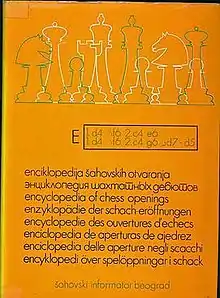The Encyclopaedia of Chess Openings (ECO) is a reference work describing the state of opening theory in chess, originally published in five volumes from 1974 to 1979 by the Serbian company Šahovski Informator (Chess Informant). It is currently undergoing its fifth edition. ECO may also refer to the opening classification system used by the encyclopedia.