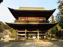 The Shariden (舎利殿) (reliquary hall[2]), is a 3×3 hall, single-storied, irimoya style, with a pent roof enclosure, covered with hinoki cypress bark shingles. It is the only building with the designation of National Treasure in the Kanagawa prefecture.