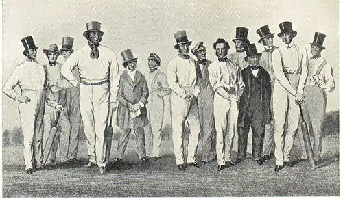The first recorded incidence of a team with a claim to represent England comes from 9 July 1739 when an "All-England" team, which consisted of 11 gentlemen from any part of England exclusive of Kent, played against "the Unconquerable County" of Kent and lost by a margin of "very few notches".[13] Such matches were repeated on numerous occasions for the best part of a century.