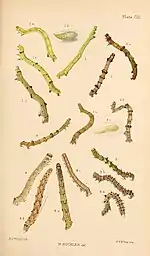 The larva which is rather elongate, with strong knob-shaped protuberances, altogether bearing a remarkable likeness to an oak twig is brown, now with a tinge of purple, now of greenish, the ventral surface paler greenish brown.It feeds on oak, birch, and lime.