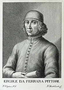 Ercole de' Roberti (c. 1451 – 1496), also known as Ercole Ferrarese or Ercole da Ferrara, was an Italian artist of the Early Renaissance and the School of Ferrara. He was profiled in Vasari's Le Vite delle più eccellenti pittori, scultori, ed architettori. The son of the doorkeeper at the Este castle, Ercole later held the position of court artist for the Este family in Ferrara. According to Vasari: