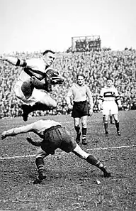 Eric Batten (Bradford Northern) hurdling over his brother Robert "Bob" Batten (Leeds) in Bradford Northern's 5-11 defeat by Leeds in the 1947–48 Yorkshire Cup 1st round 1st leg match during the 1947–48 season at Headingley, Leeds on Saturday 13 September 1947.