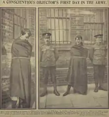 He was arrested, taken to an army barracks and told to put on a uniform; when he refused, he was held down, stripped by the guards and forced into khaki. As soon as they let him go, he pulled the uniform off again. The guards seized a blanket, strapped it round him, manacled his hands and took him to the orderly room, where a sergeant, ridiculing his appearance, took a photograph of him which found its way into the Daily Sketch.[3]