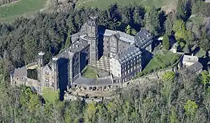 During her regency, in 1695, a major city fire destroyed a large part of the city of Siegen, including the Nassauischer Hof, the princely Residenz, and the nearby church.[12][17] Both buildings were built in 1488 by Count John V of Nassau-Siegen as a Franciscan monastery.[18] The Nassauischer Hof housed, among others, the collection of paintings of the Fürsten of Nassau-Siegen. Numerous valuable paintings by famous artists, including Rembrandt, Peter Paul Rubens and Anthony van Dyck, fell victim to the flames.[12] The nearby Fürstengruft was spared in the fire. The burnt down residence building was not rebuilt. Under the old name, a new three-winged palace was built on the site, and the Fürstengruft was completely incorporated into the corps de logis. The construction of the new palace, which has been called Untere Schloss since the middle of the 18th century, took place between 1695 and 1720.[17][19]