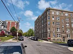 Holyoke's Essex Street Historic District is located a short way west of the city's downtown, occupying 4.9 acres (2.0 ha) centered on a three-block stretch of Essex Street. It is bounded on the northwest by Pine Street and Chestnut Street ot the southeast, extending to including properties on Walnut and Elm Streets adjacent to Essex. The district is architecturally diverse, including single-family homes on small lots, rowhouses, smaller multiunit (two and three-family) houses, and larger apartment blocks. The oldest building in the district is the Italianate Newton House on Elm Street, built c. 1877. The district is dominated by several multistory brick apartment blocks dating to the early 20th century. Also of interest are brick rowhouses lining part of Walnut Street, which date to the 1880s and have Queen Anne styling.[2]