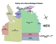 Leslie Holdridge established La Selva in 1953. Holdridge was an American botanist and climatologist who is known for his widely used classification system of land areas called The Holdridge Life Zones System. He originally purchased the land to use as a farm for experimenting with mixed agriculture, and was especially interested in experimenting with tree crops that could be planted without total clearing of the native forest.[5] In the beginning, La Selva was a challenge to get to; the trip required a long, treacherous dirt road followed by a 4-kilometer dugout canoe trip. In 1968 the Organization of Tropical Studies (OTS) bought the area for fifty thousand US dollars to be used as a private reserve and biological station.[5] OTS was a small, 5-year-old organization created with the goal of facilitating research and education in the tropics. Holdridge encouraged OTS to use La Selva as a research site even before it became OTS property.[5] Holdridge supported research at La Selva until his death in 1999. Since the station's beginnings in 1953, there have been immense changes: access is easy, buildings have been constructed, and the preserve has tripled in size.[5] It is now one of the most important sites for tropical research in the world. In the past few decades, however, the human population around the Station have increased rapidly due to several factors, including the expansion of banana production and government settlement projects.