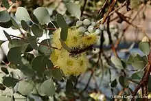 Eucalyptus orbifolia is a mallee or tree that typically grows to a height of 2.5 to 8 metres (8 to 26 ft). The tree produces showy cream-yellow flowers predominantly between mid-winter and late spring from July to November. It has rough minni ritchi bark on the trunk.[2] Like most mallees it has multiple stems. The bark is reddish brown in colour and which peels and curls outwards, exposing paler white-grey bark below. The grey-green, oval-shaped adult leaves are 25 to 40 millimetres (1.0 to 1.6 in) in length and 15 to 40 mm (0.6 to 1.6 in) wide. Each inflorescence is 20 to 25 mm (0.8 to 1.0 in) in diameter.[3][4]