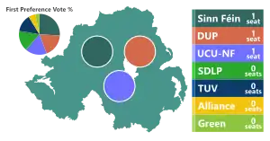 It was the DUP's worst ever European election result: the party had previously topped the poll in every European election in Northern Ireland since the first one in 1979.[6] It was also the first time an Irish Republican topped the poll, Bairbre de Brún of Sinn Féin coming first with 125,000 votes. The share of the votes for most parties in Northern Ireland remained essentially unchanged, the main exceptions were the DUP where their share of the vote fell by 13.8%, and the TUV, a party created by former DUP MEP Jim Allister whose share of the vote rose 13.7%.[7] The DUP's decreased vote share was largely blamed on the TUV splitting the vote.