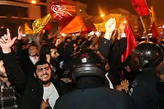 Hundreds of people held a protest rally in the Bahraini capital, Manama. Demonstrators carrying pictures of Sheikh Nimr were involved in a clash with police in the Bahraini village of Abu-Saiba.[18] Hundreds also marched in al-Daih and Sitra, chanting slogans against Saudi Arabia's ruling Al Saud family and the Sunni family ruling Bahrain, and calling Nimr "our martyr".[19]