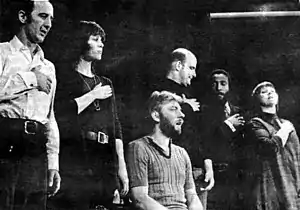 The next night they performed just outside Yokosuka Naval Base before "an audience of nearly 1,400 included some 500 GIs." Some pro-Vietnam War hecklers tried to disrupt the show and were quoted as saying "they liked to go to Vietnam to kill people because they made $65 extra a month in combat pay." Soon other members of the audience began to heckle the hecklers and then Donald Sutherland spoke to the crowd, "If you want them to leave, would you tell them?" The audience erupted in "noisy agreement" while a number of sailors from the USS Oklahoma City "slowly but surely, confidently but peacefully" escorted the hecklers out of the auditorium while Len Chandler led the crowd in shouting "Out! Out! Out!"[32][7]: p.157 There has been some speculation that the pro-war hecklers were "undercover agents and provocateurs", which was not an uncommon tactic used by police agencies during the Vietnam War era, but no proof has emerged either way.[7]: pp.169–70