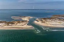 Old Inlet, just west of Smith Point County Park in the wilderness, has been the site of breaches of Fire Island causing the Atlantic Ocean to join with the Great South Bay.
