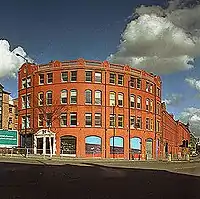 The former warehouse occupied by the club was at 11–13 Whitworth Street West on the south side of the Rochdale Canal: the frontage was curved and built of red Accrington brick. Before it was turned into a club, The Haçienda was a yacht builder's shop and warehouse.[5]