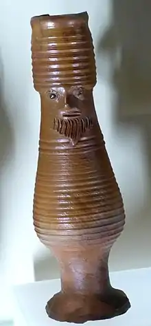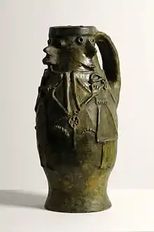 During the 13th century, craftsmen outside of London became more decorative in their style, creating more anthropomorphic vessels that would characterize medieval face jugs.[2] In the 1600s full-body vessels supposedly modeled after Edward Vernon, also known as Admiral Vernon. These pieces came to be known as British Toby Jugs.[3]