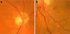 Tortuosity of the retinal arterioles, and less often microaneurysms and telangiectasia, are commonly found in FSHD.[38] Abnormalities of the capillaries and venules are not observed.[38] One theory for why the arterioles are selectively affected is that they contain smooth muscle.[38] The degree of D4Z4 contraction correlates to the severity of tortuosity of arterioles.[38] It has been hypothesized that retinopathy is due to DUX4-protein-induced modulation of the CXCR4–SDF1 axis, which has a role in endothelial tip cell morphology and vascular branching.[38]