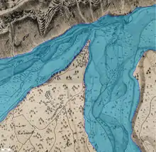 In 1954, the old village was abandoned because of the construction of Sylvenstein Dam (Sylvensteinspeicher). The village was flooded intentionally in 1959. A newly built village with the same name was created at a height of 773 metres[3] and 100 metres away from the former location.