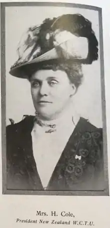 - ↑ See the letters protesting Cole's address about suffragettes in England – Hodgkinson, Edith (18 April 1912). "Correspondence – Letter to Editor". White Ribbon. 17 (202): 16. Retrieved 15 May 2021. and A Woman of New Zealand (18 June 1912). "The Suffragette". White Ribbon. 17 (204): 6. Retrieved 15 May 2021.