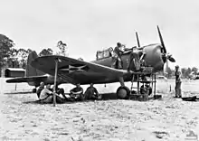 A single flyable P-40E remained at Bataan Field, although by 5 March mechanics had repaired the damaged P-40B at Cabcaben using P-40E parts, facetiously calling the composite a "P-40 something".[91] Occasional individual reconnaissance flights were made in the following month by the two craft.[92][nb 47] Brig. Gen. George was evacuated by PT boat on 11 March, ending the effective usefulness of the detachment, whose pilots were severely debilitated by starvation and disease.[93] Churchill eventually succeeded to nominal command 12 days before the surrender, but was unable to evacuate and became a prisoner of war.[94]