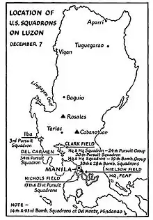 The PDAF's only major unit, the 4th Composite Group, consisted of five squadrons based at two grass fields: Clark and Nichols. A third airfield, Nielson Field, lacked facilities and was used primarily as an administrative strip for nearby Fort McKinley. An isolated sod auxiliary strip at Iba on the west coast was used for gunnery training. PDAF's materiel was centrally located in the Philippine Air Depot at Nichols Field, easily targeted from the air and highly inflammable.[10] The only existing antiaircraft defenses were a single battery of four 3-inch gun M1903 guns and a searchlight platoon at Fort Wint at the entrance to Subic Bay, which would only be marginally reinforced in September.[11]