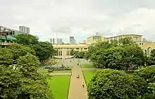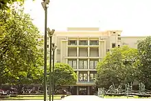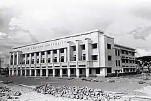 Dr. Reyes Sr., as the founding president of the University, spent his early years establishing the courses and programs for FEU. For the campus, he commissioned Architect Pablo S. Antonio Sr. to construct the main building and several structures for the University.[14] In 1940, the Nicanor B. Reyes Sr. Hall, which would later house the main library at third level and Institute of Accounts, Business and Finance, opened. Two other buildings by Antonio, the Girl's High School Building and Boy's High School Building followed.[14] Enrollment had blown with approximately 10,000 registered students and an international student population of 400.[15][12] Former Philippine President Manuel L. Quezon hailed and called FEU "the best non-sectarian institution in the country."[16]