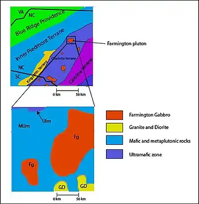 Located in the Charlotte Belt of North Carolina is the Farmington Gabbro, located in the Mocksville Complex.[1] The Mocksville Complex consist of metamorphosed/unmetamorphosed gabbros, pyroxenites, hornblendites, wehrlites, granites, and diorites.[2] The plutons in this region formed during the Taconic, Acadian, and Alleghanian orogeny starting on the eastern side of Laurentia.[3] These plutons date back to around 400 Ma, consisting of ultramafic, mafic, and felsic rocks but the Farmington Gabbro is the only pluton on the northwest side of the complex that is unmetamorphosed.[2][4]