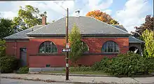 Designed by William R. Walker & Son and constructed by S. Mason & H. A. Smith in 1886, the one story red brick Queen Anne style building is basically rectangular with a low-pitched hipped roof. The red bricks are laid in dark red mortar and is contrasted by the granite sill course and brownstone belt course at window sill level. The building has a central closed entry pavilion which projects out and has two porches oriented to face Mulberry and Cedar Street. The building has three lunette windows on the sides of the main block, each divided into thirds, and a smaller windows on the pavilion's pedimented end. The rear ell has double hung two-over-two sash windows. At the time of the nomination, during the renovations to a single family home, the house had its Cedar Street porch closed in with plywood and the smaller lunette windows were boarded in, but the exterior wooden trim was largely extant.[2]
