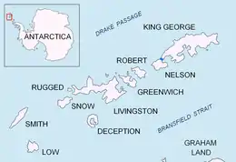 Fildes Strait is a strait which extends in a general east-west direction between King George Island and Nelson Island, in the South Shetland Islands. This strait has been known to sealers in the area since about 1822, but at that time it appeared on the charts as "Field's Strait". It was probably named for Robert Fildes, a British sealer of that period,[1] whose vessel Robert was wrecked in Clothier Harbour in 1822.