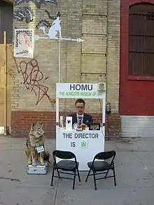 In 2002, Noterdaeme created the Homeless Museum of Art (HOMU), a conceptual Gesamtkunstwerk that aimed to expose and send up the practices of contemporary art museums.[4] Assuming the role of self-titled museum director, he presented a first version of the museum as a pop-up exhibit in an art studio in Chelsea[11] and wrote letters to leading figures of cultural institutions, offering tongue-in-cheek critique and absurdist ideas for possible collaborations.[12] Noterdaeme’s second manifestation of the project, in 2004, was a public protest action[13] that raised awareness about the fact that the Museum of Modern Art, following its multi-million-Dollar expansion, had hiked its admission fee by 63%.[14] In 2005, the Swiss Institute Contemporary Art New York exhibited a new incarnation of HOMU at the Armory Show,[15] presented as a makeshift booth inspired by Lucy’s Psychiatry Booth from Charles M. Schulz’ Peanuts comic strip series. It included a tour of Noterdaeme's apartment in Brooklyn that he and his partner Daniel Isengart had turned into a live-in pastiche of a contemporary art museum, including a guided audio tour, shop, café and a “Staff And Security Department,” where Noterdaeme, wearing a fake beard, and introducing himself as HOMU's Director, held court in the style of Louis XIV's lever, using a Taxidermy Coyote to represent his press secretary.