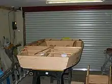The Firebug is constructed on a rigid jig with 6 timber stringers and a centerline web. The flat bottom is 600 mm wide and is made from 9 mm marine plywood. The sides, bilge panels bulkheads and deck are cut from 2.5 panels of 4 mm marine plywood. The minimum weight of the completed hull is 40 kg[3] (sometimes cited as 27 kg[4]).