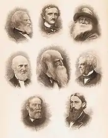 Critics, meanwhile, began re-examining the role of these poets in the canon and distinguishing between popularity and aesthetics.[19] As the twentieth century began, academics began to turn to poets such as Walt Whitman, Edwin Arlington Robinson, and Robert Frost.[20] Anthologist Edmund Clarence Stedman released his exhaustive An American Anthology, 1787–1900, and the frontispiece artwork featured the fireside poets sharing space with Whitman, Edgar Allan Poe, and Sidney Lanier, which visually emphasized the canonical shift.[14]