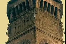The current church building (fifth meeting house) was designed by the notable architect Henry Hobson Richardson and built in 1869–71. It opened in 1872 to serve the Unitarian congregation of the Brattle Street Church, also known as the Church in Brattle Square, which had been demolished in 1872.[5] The Unitarian congregation dissolved soon after moving to this building.[6] The First Baptist congregation bought the building in 1881 for a sum of $100,000/00. The historic and prominent tower with distinctive friezes carved "in-situ" by Frédéric Auguste Bartholdi (sculptor of the Statue of Liberty) representing four sacraments, with faces of famous Bostonians (including Longfellow and Hawthorne), Abraham Lincoln, and Bartholdi's friends of that era, (including Garibaldi). This building was Richardson's first church in Boston before he designed his masterpiece, Trinity Church. This church was added to the National Register of Historic Places in 1972. The congregation is affiliated with the American Baptist Churches USA.