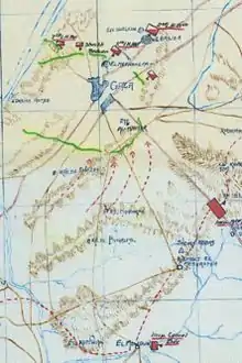 The main Ottoman force of between two and a half and three divisions, estimated between 6,000 and 16,000 rifles, were deployed at Tel el Negile and Huj with detachments at Tel esh Sheria, Jemmameh, Hareira, Beersheba, and Gaza, to prevent the EEF from out-flanking Gaza.[7][43][44] The rear of the EEF was to be attacked by the Ottoman 16th Division, at a point where the road from Khan Yunis to Gaza crossed the Wadi Ghuzze, and by the Beersheba Group which was to advance via Shellal, to attack Khan Yunis.[28]