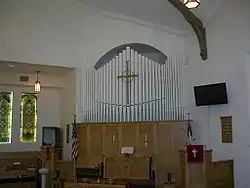 In 1908 the church received a new pastor, the Reverend George Sheldon. After a couple of years, Reverend Sheldon urged the congregation to secure a pipe organ.[24] The various organizations of the church began raising funds. In addition, $1,000 was donated by Andrew Carnegie, who had retired from his many business enterprises and become a nationally known philanthropist.[1] The new pipe organ cost over $2,000, and was installed in 1912 after the platform for the choir and pulpit was enlarged to accommodate the magnificent new instrument. The dedication recital was played by Professor Isaac Norris of DePauw University. The first regular organist was Professor Carl Bilby of Muncie, Indiana.[43] The pipe organ is thought to be the city's first, and is still used today.[3] The photo herein, from 2010, shows the church's pulpit and “pipe” portion of the pipe organ. “Smaller” stained glass windows can be seen to the left near the choir loft. These windows were part of the eastern wall of the church before the addition of the East Wing.