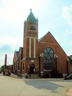 Construction of the house of worship began in 1892 and was completed in 1893. The church building is considered one of the city's best examples of the Richardsonian Romanesque style of architecture.[3] One aspect of the building that makes it particularly notable is its windows. The church features massive stained glass windows that were hand-crafted in Belgium and assembled by local glass workers originally from that country.[1]