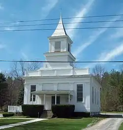 First Presbyterian Church of Tuscarora is a historic Presbyterian church located at Tuscarora in Livingston County, New York. It was built about 1844 and is a three- by five-bay Greek Revival style frame building. The gable roof is surmounted by a short, two stage tower topped by a pyramidal roof with a slight concave curve with a cross at its apex. The interior features an elaborate Eastlake style three tier oil chandelier suspended in the center of the sanctuary over the main aisle. It is last surviving public building from the hamlet's brief early to mid-19th century commercial prosperity related to its location on the Genesee Valley Canal.[2]
