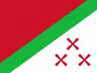 DesignFlag divided diagonally from lower hoist-side to the upper fly-side into two fields, one red and the other white. The fields are separated by a green band. In the white field are three red Katanga crosses.