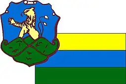 The flag of Lewin Brzeski is the flag of the town of Lewin Brzeski, Opole Voivodeship, in Poland. The flag is arranged in a tri-colour of: yellow, blue and green; with a shield, presenting the coat of arms of Lewin Brzeski in the top-left corner of the flag.[1]