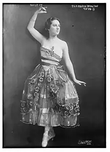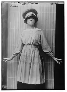 Born in 1890 in Wilmington, Delaware, Walton made her debut in 1907 in the chorus of the musical comedy The Girl Behind the Counter, produced by Lew Fields.[2] Florence helped popularize the tango, fox-trot and other forms of ballroom dancing with her husband, Swiss-born Maurice Mouvet, and later with Allan Fagan and Leon Leitrim. Walton was introduced to Mouvet by the musical manager Florence Ziegfeld in 1911 when Ziegfeld partnered the two in his production of The Rose Maid.[3] They married that same year and together formed one of the most successful exhibition ballroom teams of their day as well as became two of cabaret's earliest stars.[2] Together they were promoted as Maurice and Walton, or simply "The Waltons."[4] During America's dance mania of the 1910s Florence Walton and Maurice Mouvet were considered as a team second only to The Castles.[5] Walton claimed to be the first American to entertain American troops in the war zone during World War I, claiming in 1914 during a performance with Mouvet at the Palace that during her time abroad she had taught King George V and Queen Mary the tango.[1] The internationally famous couple divorced in 1920.[3]