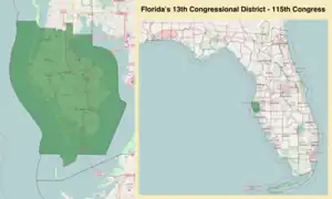 Florida's 13th congressional district is an electoral district for the U.S. Congress on Florida's Gulf Coast, assigned to Pinellas County.[5][6] The district includes Largo, Clearwater, and Palm Harbor. In the 2020 redistricting cycle, most of St. Petersburg facing Tampa Bay was redistricted into the 14th district, while the rest of Pinellas County formerly in the 12th district became included in the 13th district.