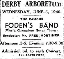 Conductor Fred Mortimer (1880–1953) led Fodens for 27 years from around 1927 until his death in 1953. During that time they won the national championships eight times, and according to Mortimer, had been broadcast around 250 times.[6]