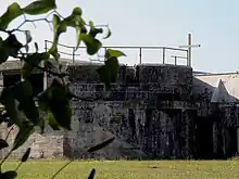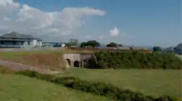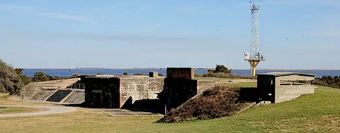 Located in North Carolina on the Atlantic Coast, the Fort Caswell Historic District encompasses 2 sites, 43 buildings, and 23 structures; it was added to the National Register of Historic Places in 2013.[2] The fort itself was occupied by various branches of the U.S. armed forces for most of the period between 1836 and 1945 and is now a part of the North Carolina Baptist Assembly, a Christian retreat, owned and operated by the Baptist State Convention of North Carolina. It is accessible by the public to a limited extent per the conditions set forth by the Assembly’s Director.[3]