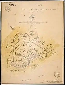 Late in 1776, Virginia's Revolutionary government constructed the fort of timber and rammed earth.[4] It was built for a garrison of 150 men near previous entrenchments from 1774, with the work supervised by Benedict Arnold, who was with the patriot forces at the time.[1] A fort on the future site of Fort Norfolk was also built across the river.[5] In 1779, a British fleet commanded by Admiral Sir George Collier confiscated its artillery and supplies and destroyed most of the parapet; the garrison evacuated the fort before it was captured.[1][4] During 1781, both Benedict Arnold (having defected to the British) and Lord Cornwallis occupied the fort.[4] A 1781 British map of fortifications erected by them on the Elizabeth River indicates that they rebuilt Fort Nelson, and shows a fort on the future site of Fort Norfolk.