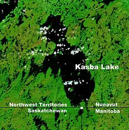 The four corners area is located between Kasba Lake to the north and Hasbala Lake to the south. It is located by an area of marginal taiga forest, which happens to be the only place in Nunavut which is not Arctic tundra or ice cap.[2] It is hundreds of kilometres from any road or railway, but can be accessed from nearby Kasba Lake Airport/Water Aerodrome as well as from Points North Landing near Wollaston Lake.[3]