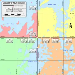 The four corners is a quadripoint near 60° N 102° W where four Canadian provinces or territories meet.[1][2] These are the provinces of Manitoba and Saskatchewan and the territories of the Northwest Territories and Nunavut.[1] It came into being with the creation of Nunavut on April 1, 1999.