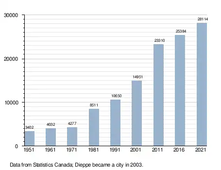 - 1 2 Government of Canada, Statistics Canada (February 9, 2022). "Profile table, Census Profile, 2021 Census of Population - Dieppe, City (C) [Census subdivision], New Brunswick". www12.statcan.gc.ca. Retrieved March 11, 2023.