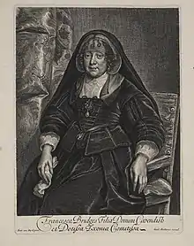 After a serious illness contracted in late 1622, Thomas died in February 1623. Widowed again, Frances devoted herself to getting her daughter, Margaret, a husband, settling on MP Thomas Carey. In the 1630s, the countess had her portrait painted by Anthony van Dyck. This portrait was lost in the 19th century, surviving in engraved and drawn copies. Frances lived another 30 years, as her daughter was widowed and remarried to Edward Herbert. Cecil died in 1663, between 20 January and 17 July, when her will was signed and probated, respectively. Thomas Cecil reserved a space for her in his monument at Westminster Abbey, but Frances chose instead to have her grave in the floor of Winchester Cathedral.[1]