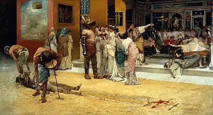 3. The painting of Gladiator Games at Museo di Capodimonte. The painting at the website is described as not as a mere evocation of the ancient past, since some details such as the gladiatorial helmet are accurate, while others, the slaying of a gladiator as meal entertainment, less so, however, the painting has a more contemporary implication, depicting the persistent gulf between the well-fed plutocrats and the enslaved proletariat.
