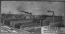 "In 1877 the company employed 6 men and produced about 150 machines a year, in 1912 he owned 8 buildings, employed a thousand men and produced two thousand machines a year. Mr. Reed retired in 1912 and the Reed-Prentice Co. was formed which took over management of the Prentice Bros Co., The F. E. Reed Co., the Reed Foundry Co., and The Reed-Curtis Machine Screw Co. This corp had a capitalization of $2,000,000. Mr. Reed remained as director. He died in 1917."[3]