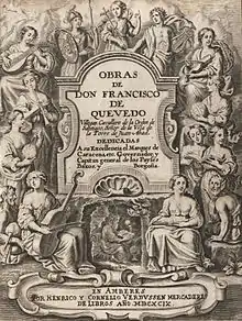 Quevedo produced a vast quantity of poetry.[12] His poetry, which was not published in book form during his lifetime, "shows the caricature-like vision its author had of men, a vision sometimes deformed by a sharp, cruel, violently critical nature."[13] This attitude is of a piece with the "black seventeenth century"[14] he lived in. Despite his satirical work, however, Quevedo was primarily a serious poet who valued love poems.[13]