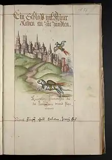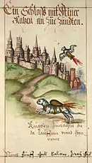 One method described by Helm has attracted attention for its illustration of what has been dubbed a 'rocket cat' – a feline with what appears to be a rocket on its back propelling it towards a castle or fortified town. The same illustration also shows what appears to be a rocket-propelled dove. The illustration appears in various forms in different manuscript versions of Helm's book, as well as in the 1625 printed edition. The images appear in a section titled "To set fire to a castle or city which you can't get at otherwise," in which Helm describes ways of using incendiary devices strapped to animals to set fortified places on fire.[5] He writes: